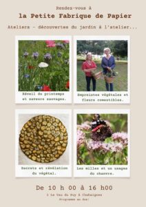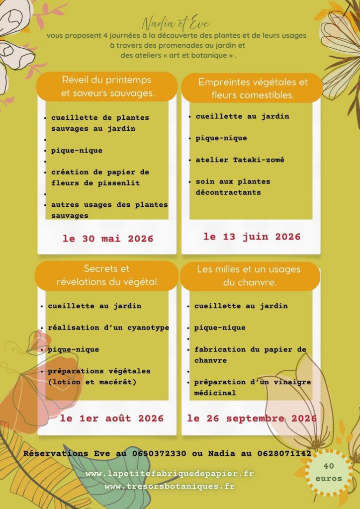 Nadia et Eve vous proposent 4 journées à la découverte des plantes et de leurs usages à travers des promenades au jardin et des ateliers « art et botanique »